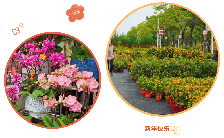 美食摊位、年花/桔摊位、大型盆栽、逛艺摊位、文创摊位、新春对子、年货等摊位。