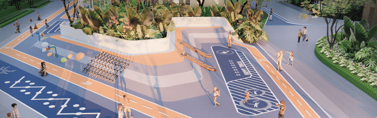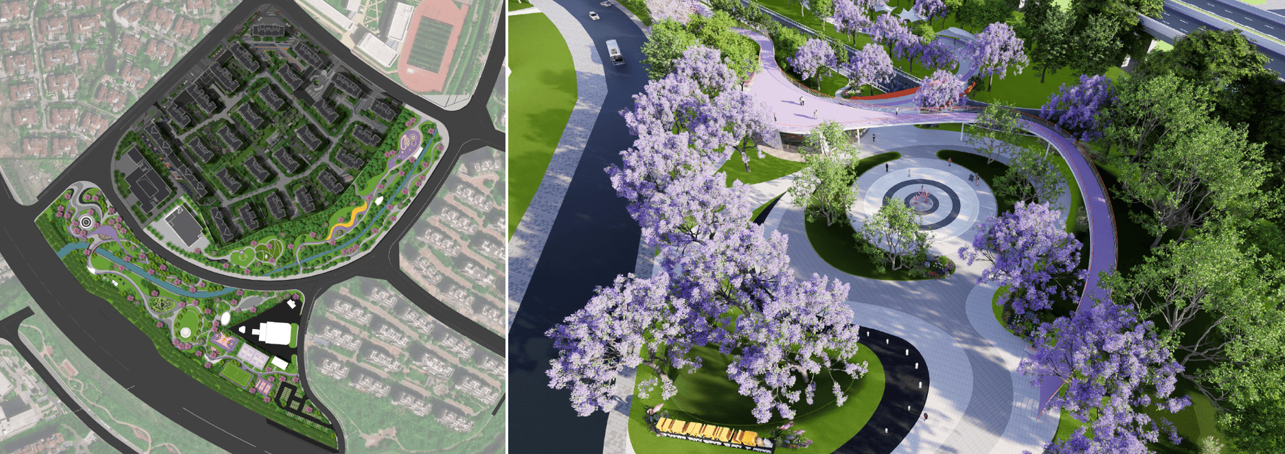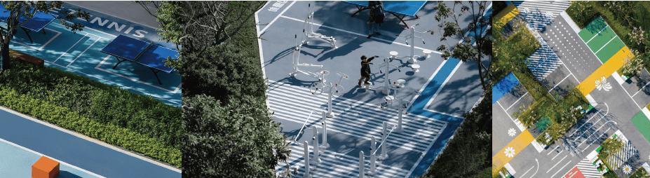 运动编制:600米强健跑道+健身器材区+社区运动场地,地面采用悦动铺装,周边种植大腹木棉、新颖月季,运动同时享用花香与绿意。