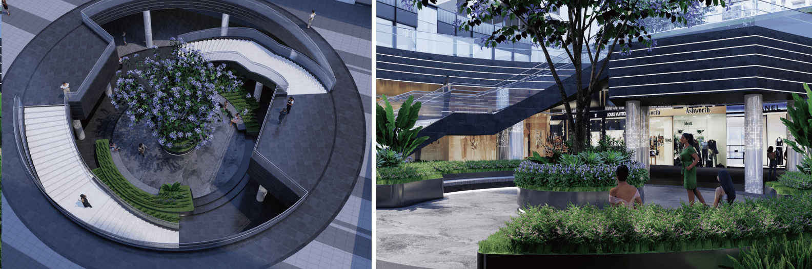 主题摆设:约822㎡阳光草坪+景观平台+点景雕塑,可举办露天片子、亲子举动等,周边种植蓝花楹、丛生香樟,春夏赏花、秋冬观叶,四序有景。